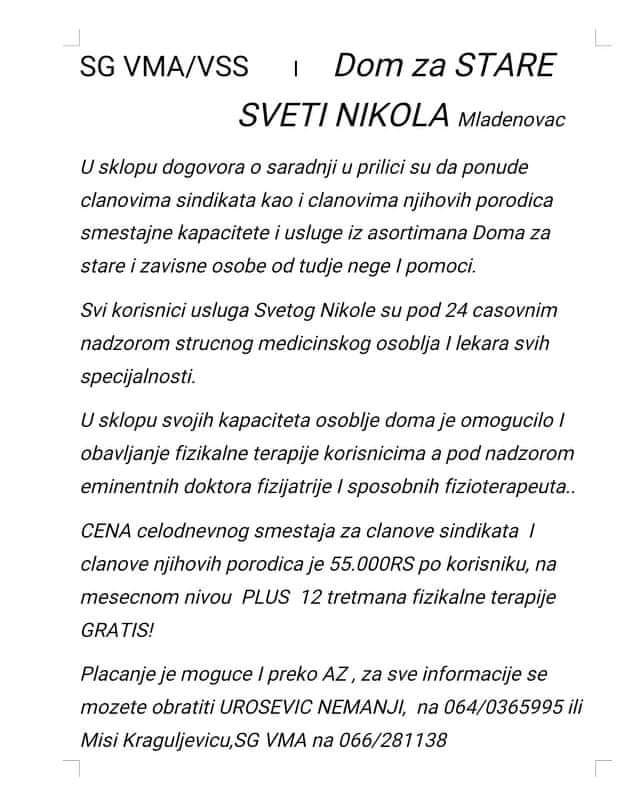 СГ ВМА / ВСС и Дом за старе “Свети Никола” Младеновац. Посебне погодности за чланове ВСС и чланове њихових породица! Смештај и медицинска нега старих, покретних и непокретних лица. Могућност смештаја и обављање физикалне терапије у објекту дома!