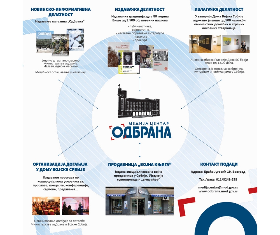 Новинско-информативна делатност установе обухвата издавање магазина „Одбрана” и уређивање веб портала Министарства одбране и Медија центра „Одбрана”. Одбрана наставља традиције „Ратника”, првог званичног војног гласила у Србији, који је почео да излази 24. јануара 1879. године. Тај дан обележава се као Дан Медија центра „Одбрана”.